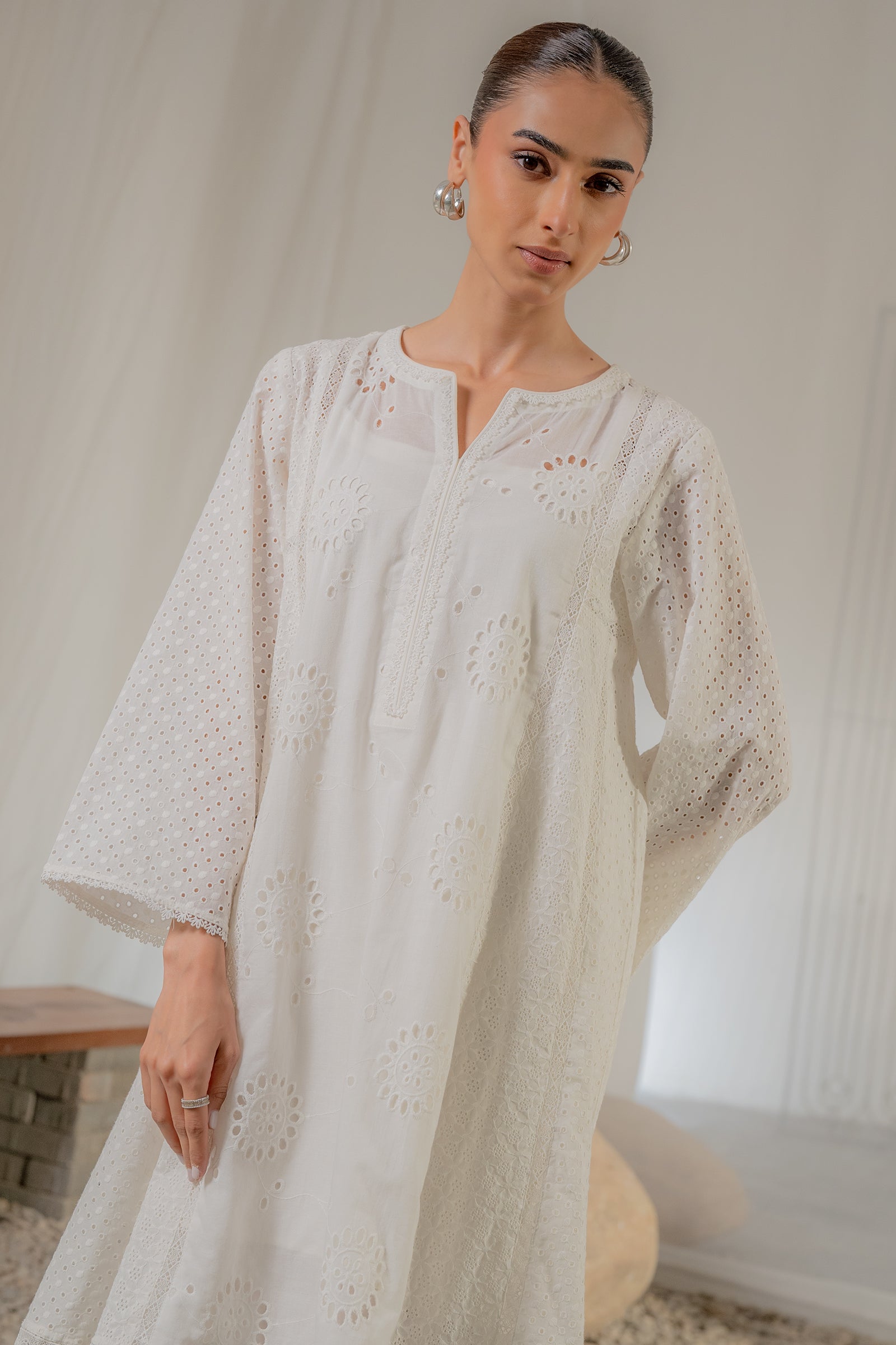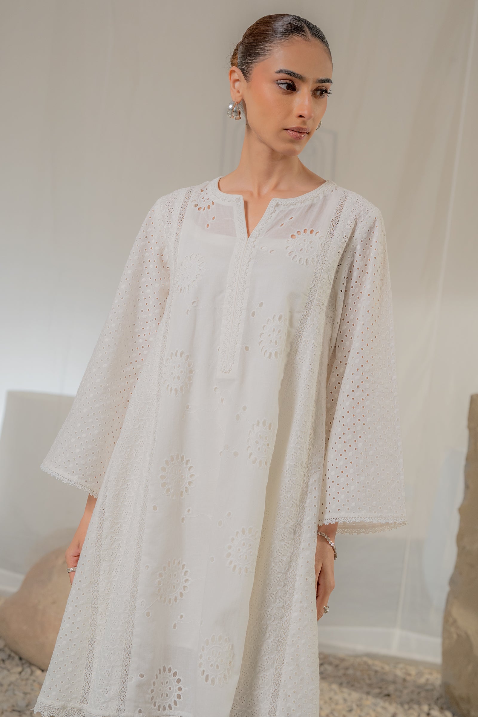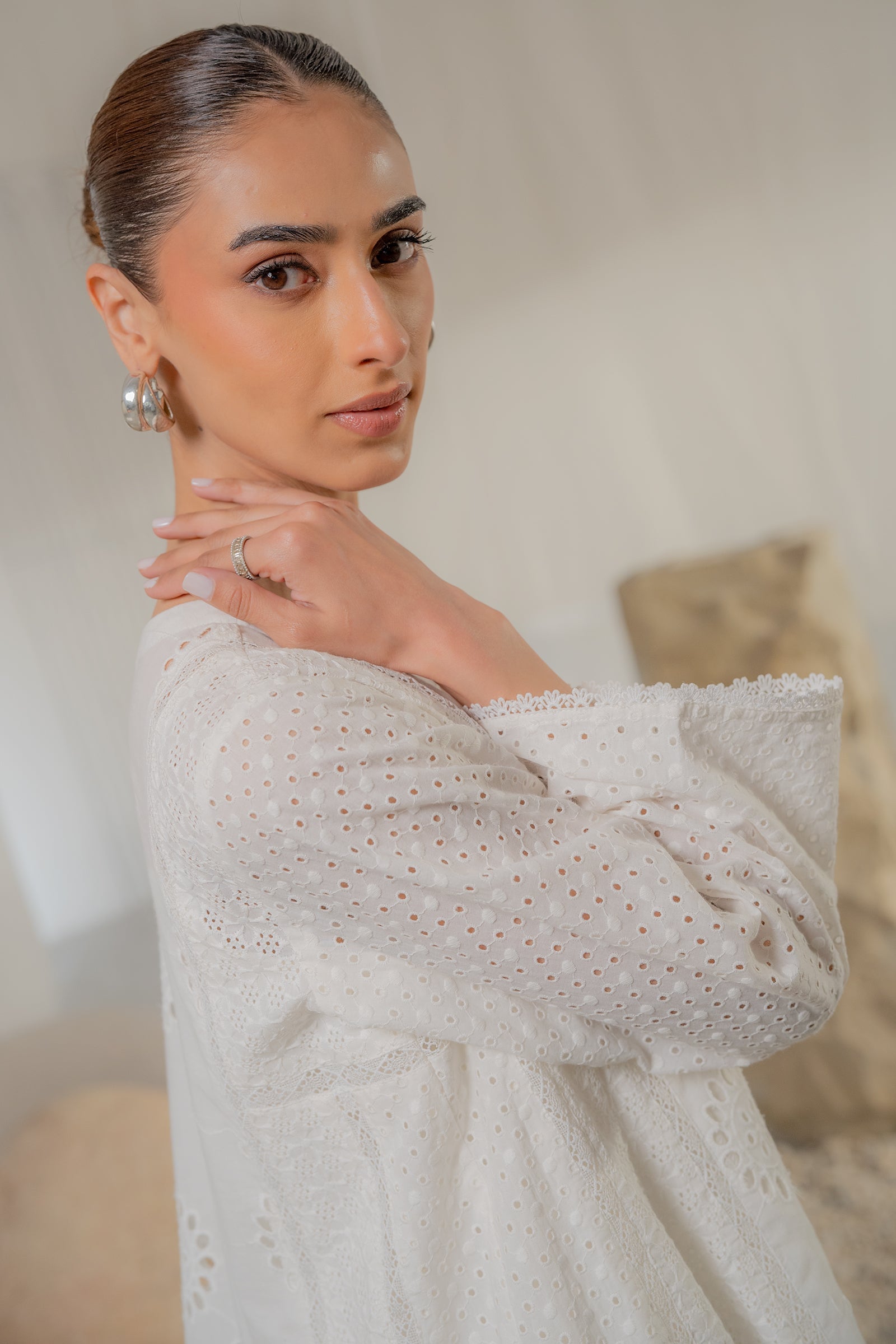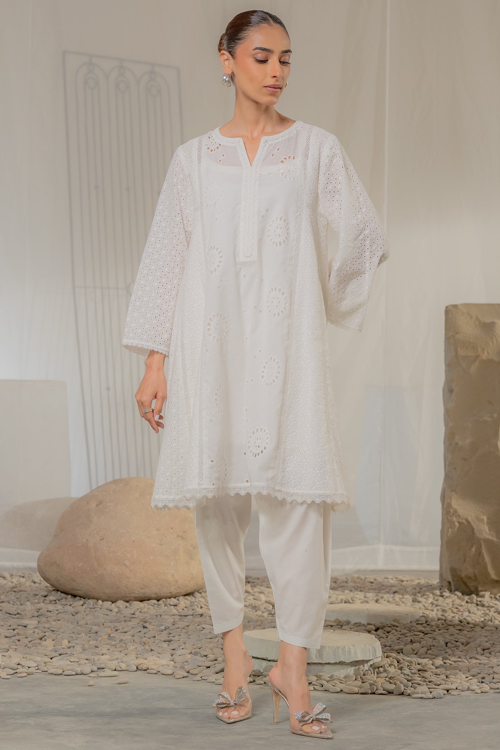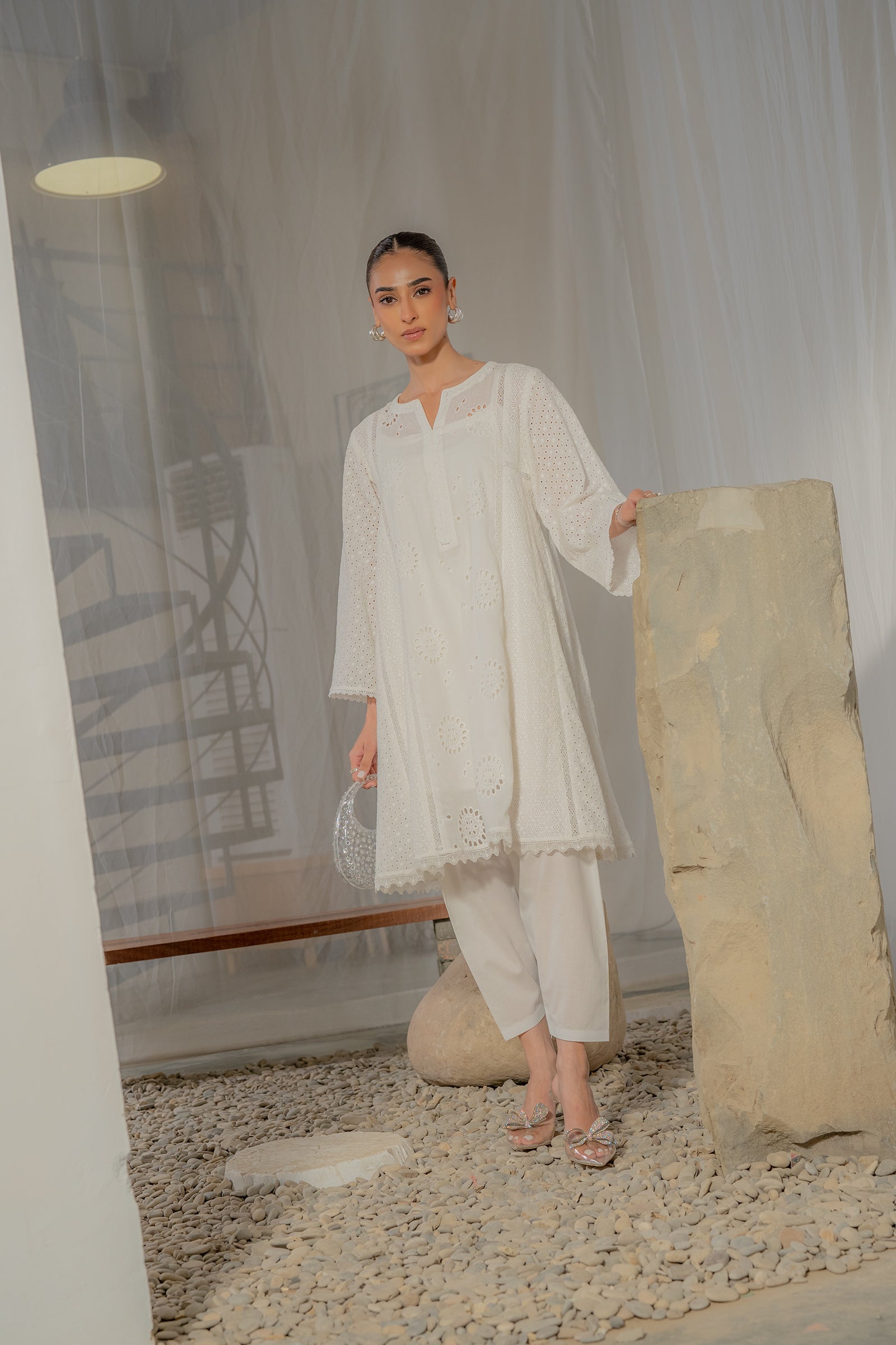 Gracefully minimal and effortlessly refined, the Pure Ivory Schiffli Embroidered Kurta Set is a timeless wardrobe essential. Crafted in a soft ivory tone, this ensemble features delicate schiffli embroidery with intricate cutwork detailing that adds texture and sophistication.